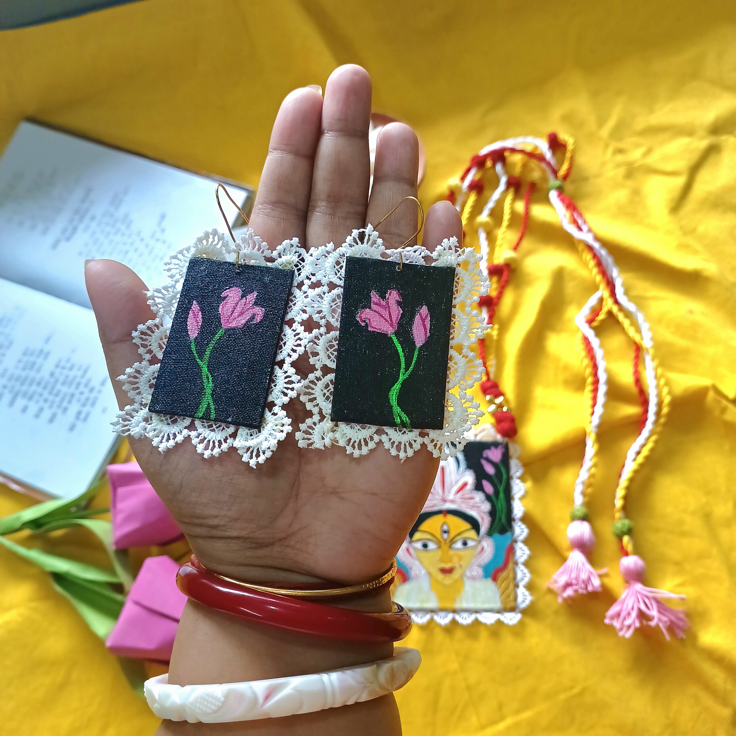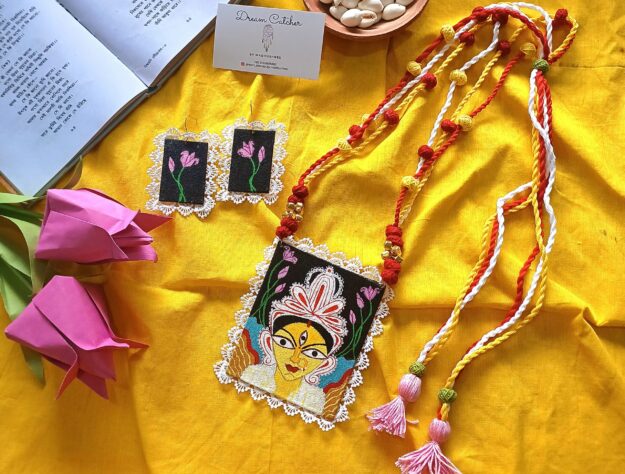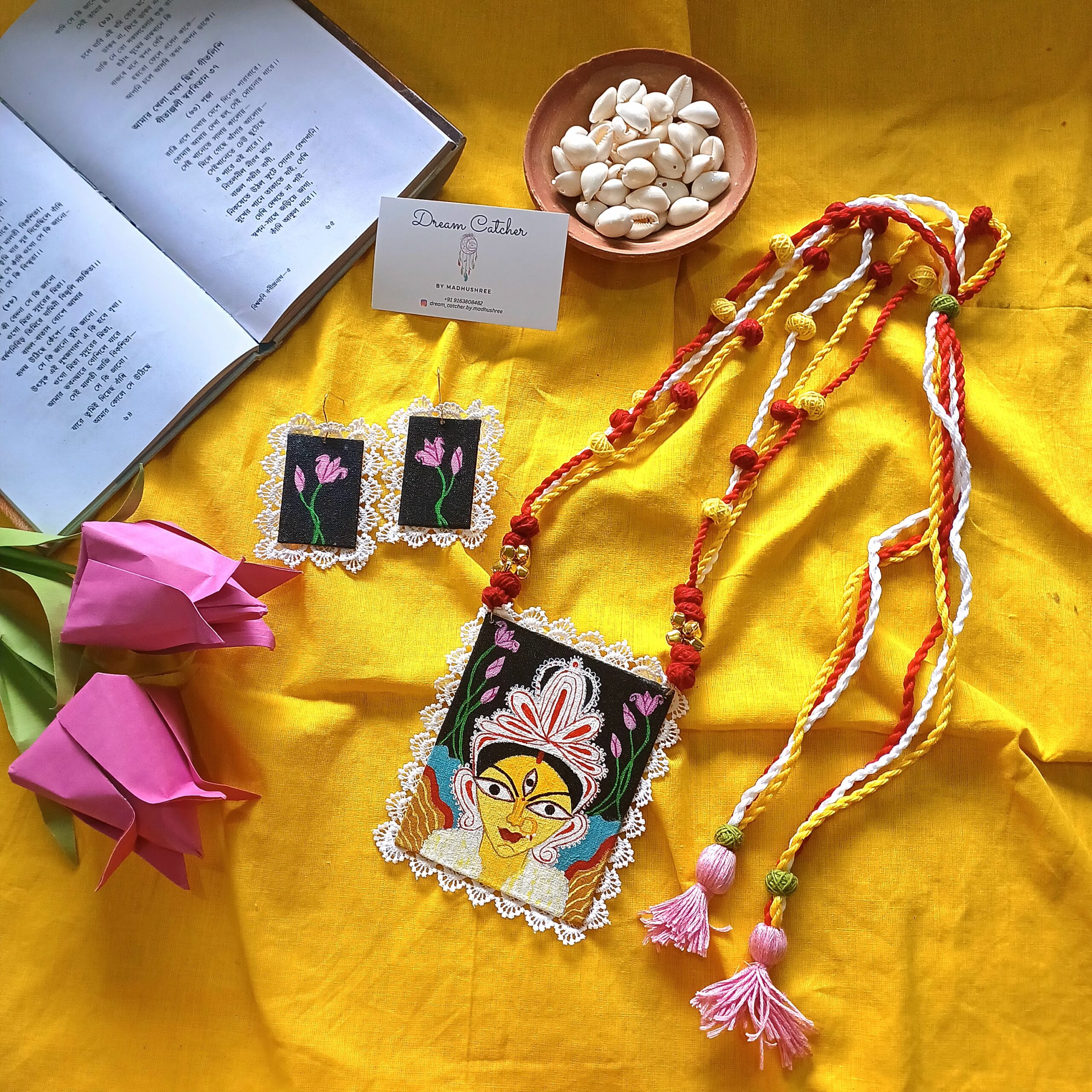- This beautiful handmade jewelry set is a stunning example of artistry and devotion brought together in a wearable form. The centerpiece of the set is a striking necklace featuring a hand-painted portrait of Goddess Durga, symbolizing strength, grace, and divine energy. The artwork is carefully bordered with delicate lace, adding a soft, intricate touch that enhances its traditional charm. The necklace is further adorned with braided multi-colored threads in shades of red, yellow, and white, embellished with small handcrafted knots and finished with tassels in soft pink hues, giving it both vibrancy and elegance. Complementing the necklace are a pair of rectangular earrings showcasing hand-painted floral motifs in delicate pink tones, also framed with lace that beautifully ties the design together. Lightweight and thoughtfully designed, this set is perfect for festive occasions, cultural celebrations, or as a meaningful piece that connects tradition with contemporary fashion. Each detail reflects fine craftsmanship and creativity, making it not just jewelry, but a work of art that carries cultural depth and timeless beauty.