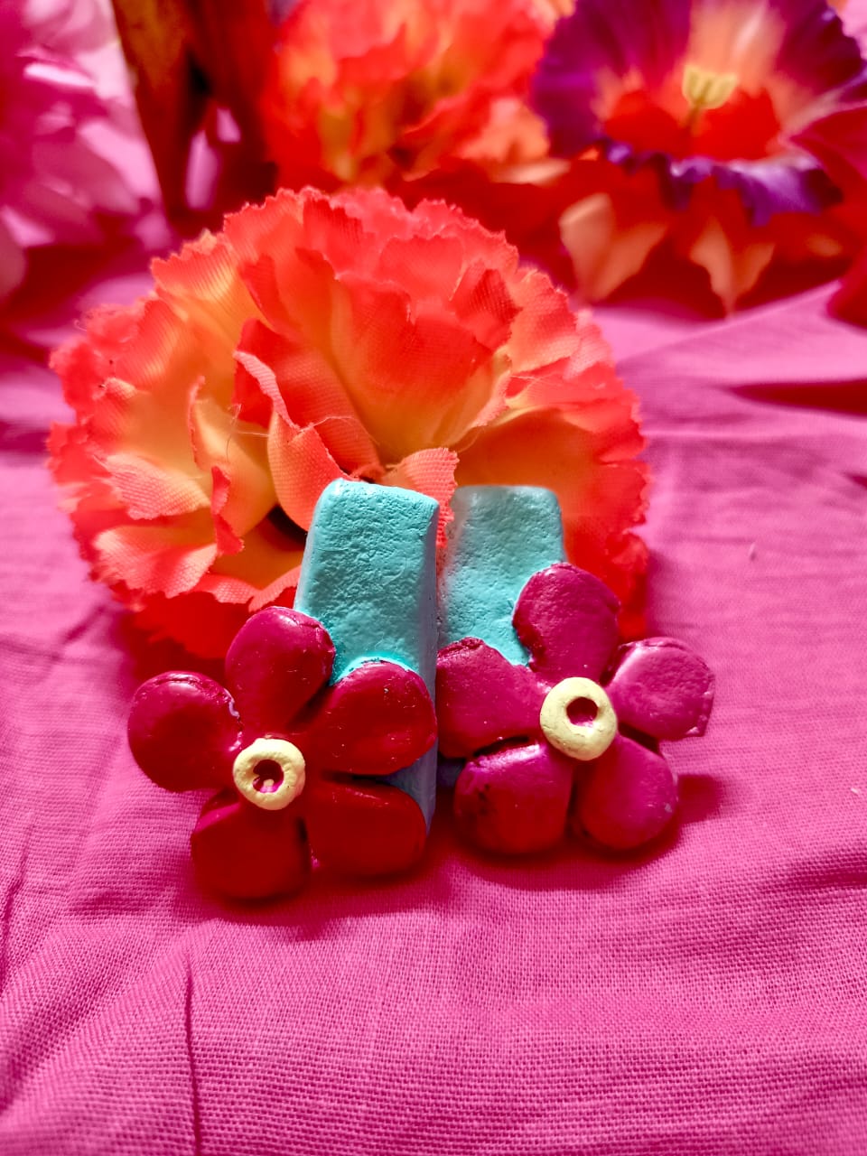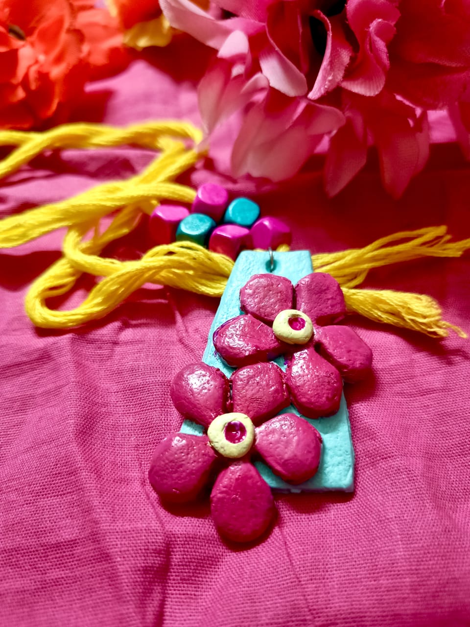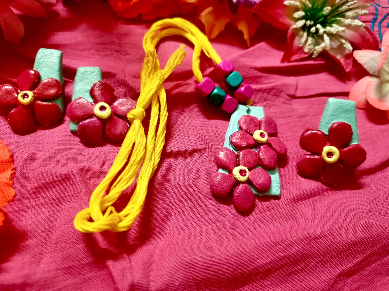 There’s a necklace with a yellow cord, pink and green beads, and a mint-green pendant with a pink flower on it. And there are matching earrings – mint-green with red flowers.