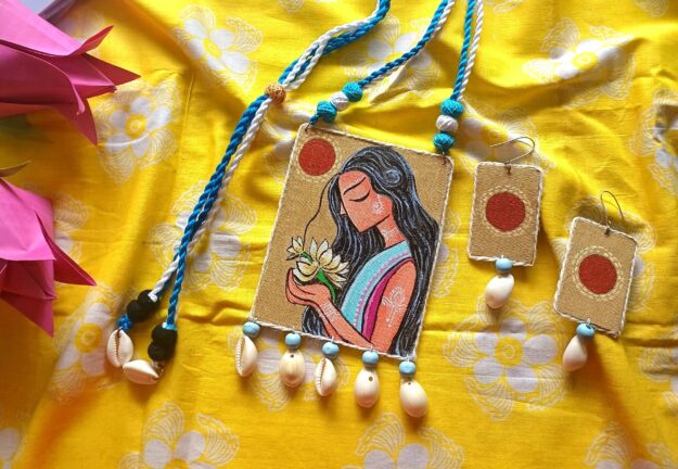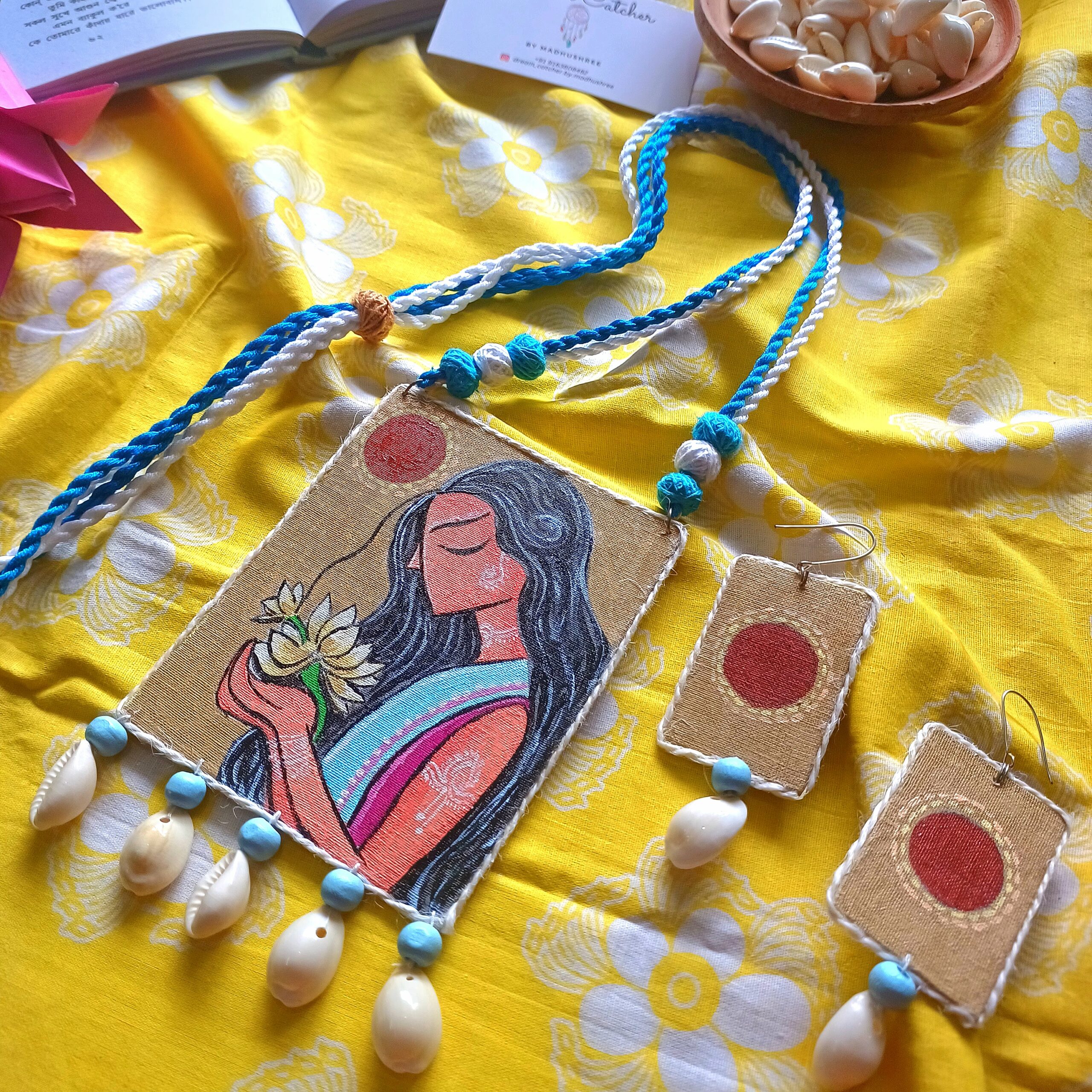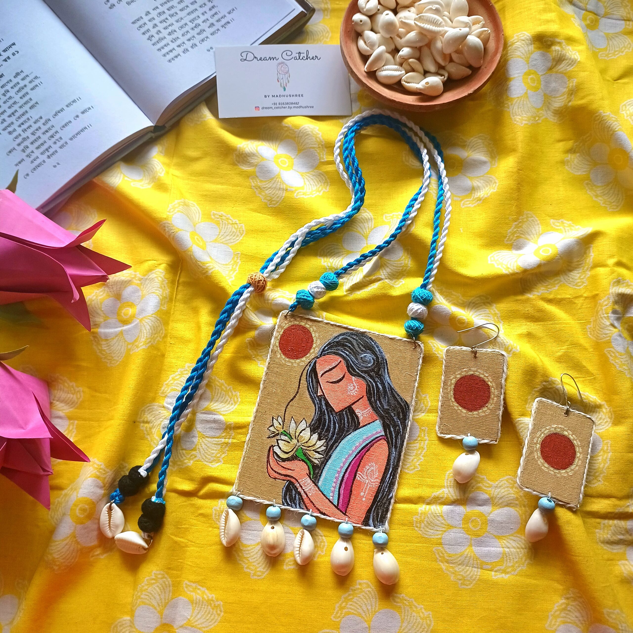 - This exquisite handmade jewelry set is a true work of art, combining traditional craftsmanship with a unique artistic touch. The necklace features a beautifully hand-painted pendant that portrays a graceful woman holding lotus flowers, symbolizing peace, purity, and devotion. The delicate painting is enhanced with vibrant yet soothing colors, making the design stand out while maintaining an elegant charm. The pendant is further adorned with small beads and seashells that add a natural, earthy appeal, creating a perfect harmony between art and nature. The braided blue and white cord of the necklace not only provides strength but also adds a striking contrast to the pendant, making it visually appealing. Accompanying the necklace are matching earrings designed with the same artistic base, accented with seashells and beads to complement the overall look. This set is perfect for those who appreciate handcrafted jewelry that tells a story through its design, offering both cultural richness and modern elegance.