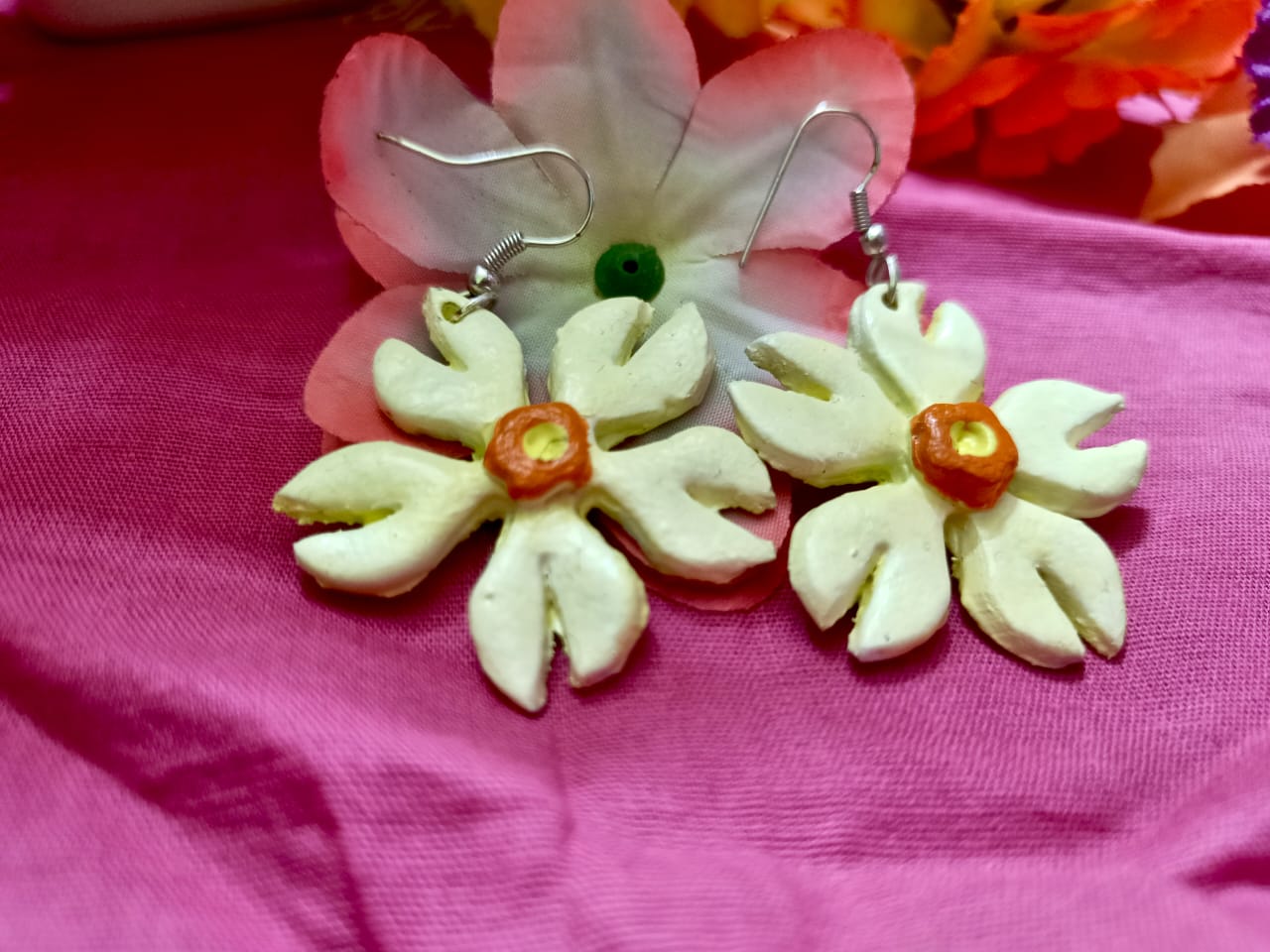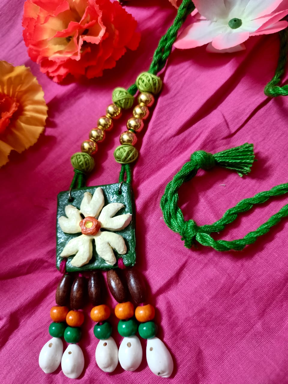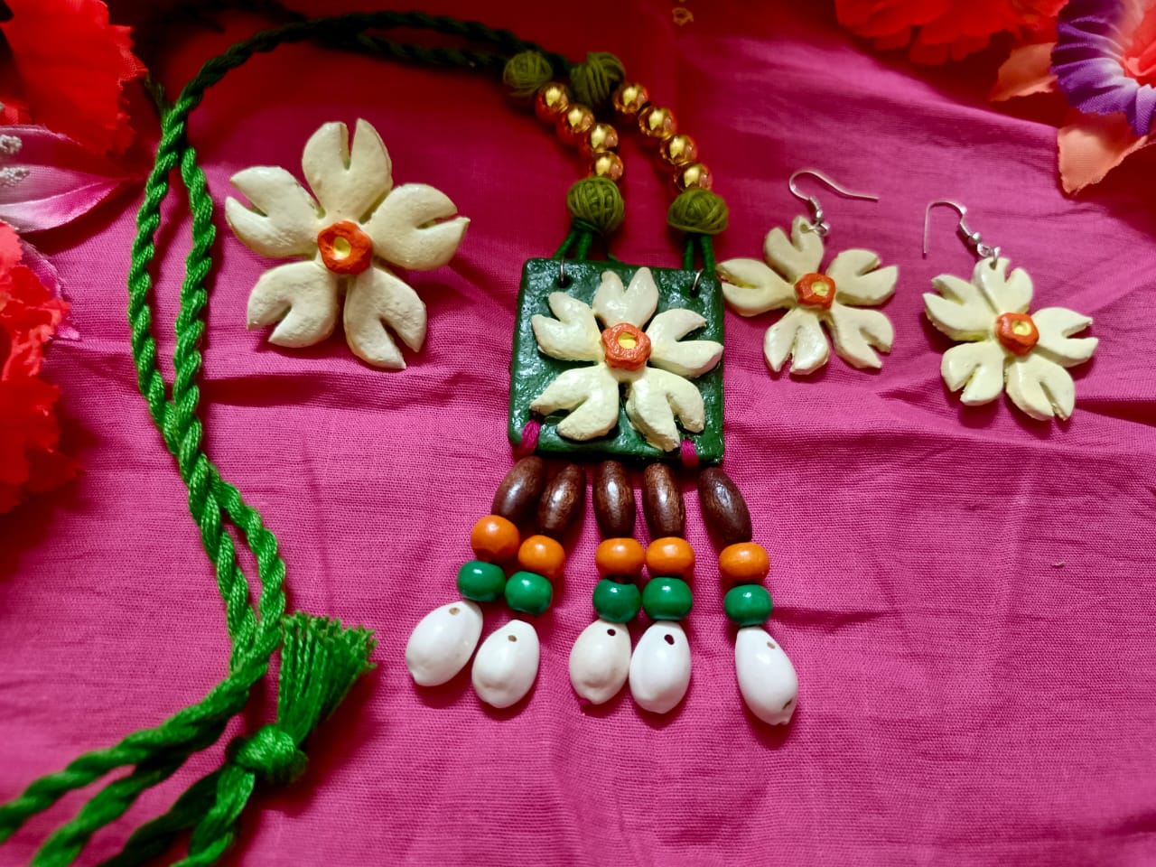The set includes a necklace with a green square pendant adorned with a white flower and orange center, accompanied by brown, green, orange, and white beads. Matching flower-shaped earrings with orange centers complement the necklace.